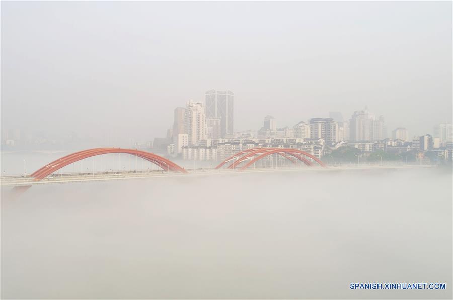 Imagen aérea de niebla de advección permaneciendo sobre el Río Liujiang en Liuzhou, en la Región Autónoma Zhuang de Guangxi, en el sur de China, el 2 de abril de 2018. (Xinhua/Li Bin)
