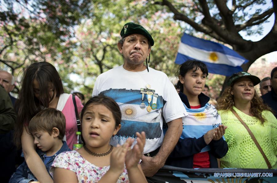 El veterano de guerra Gregorio Encina (c), participa en un acto por el 36 aniversario de la Guerra de las Malvinas, en la Plaza San Martín en Buenos Aires, capital de Argentina, el 2 de abril de 2018. De acuerdo con información de la prensa local, los asistentes al acto se reunieron en el Monumento a los Caídos, en donde están grabados los nombres y apellidos de 649 argentinos que murieron defendiendo a las islas de la flota británica. (Xinhua/Martín Zabala)