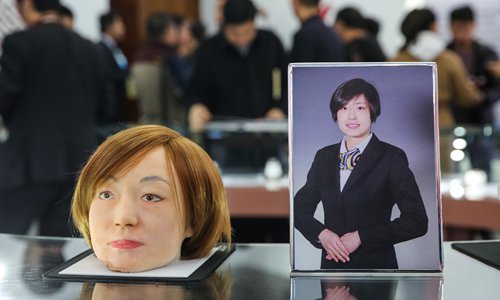 Una cabeza impresa en 3D junto a la foto de una empleada en la funeraria Babaoshan en Beijing. Foto: VCG
