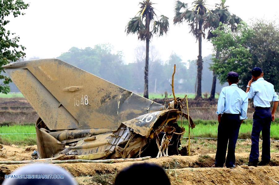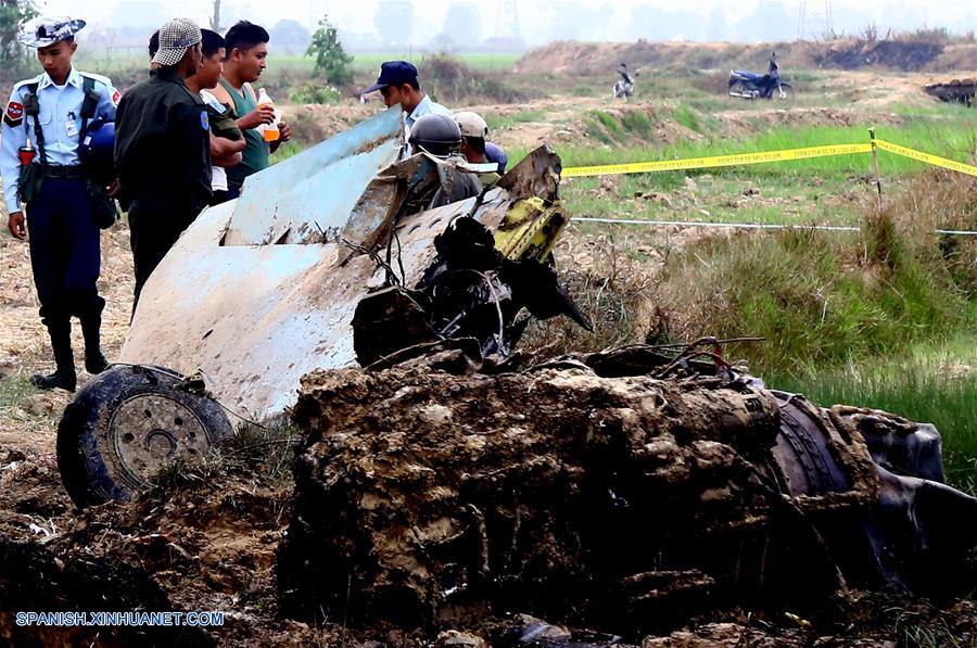 TAUNGOO, abril 3, 2018 (Xinhua) -- Personal de seguridad observan los escombros en el sitio de un accidente de un avión de entrenamiento militar en Taungoo, en la región de Bago, en Myanmar, el 3 de abril de 2018. Un piloto murió el martes por la ma?ana al estrellarse un caza F-7 del ejército de Myanmar durante un vuelo de entrenamiento en Taungoo, localizado en la región de Bago, reportó la oficina de servicios de Defensa. (Xinhua/Str)