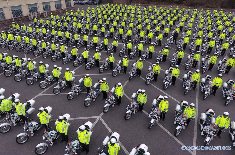 Vista aérea de oficiales de policía de tránsito montando sus nuevas motocicletas en Qingdao, en la provincia de Shandong, en el este de China, el 3 de abril de 2018. (Xinhua/Li Ziheng)