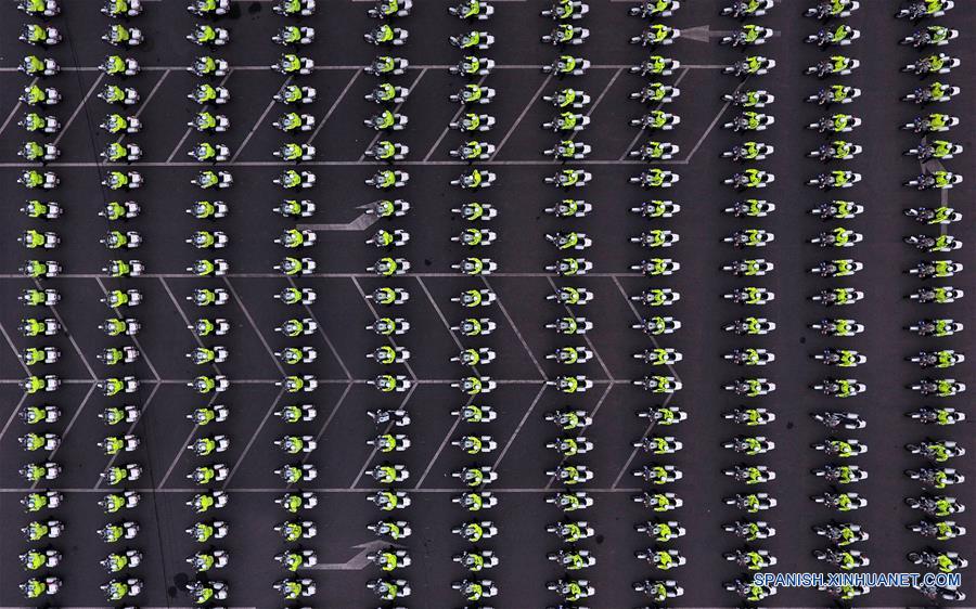 SHANDONG, abril 3, 2018 (Xinhua) -- Vista aérea de oficiales de policía de tránsito montando sus nuevas motocicletas en Qingdao, en la provincia de Shandong, en el este de China, el 3 de abril de 2018. (Xinhua/Li Ziheng)