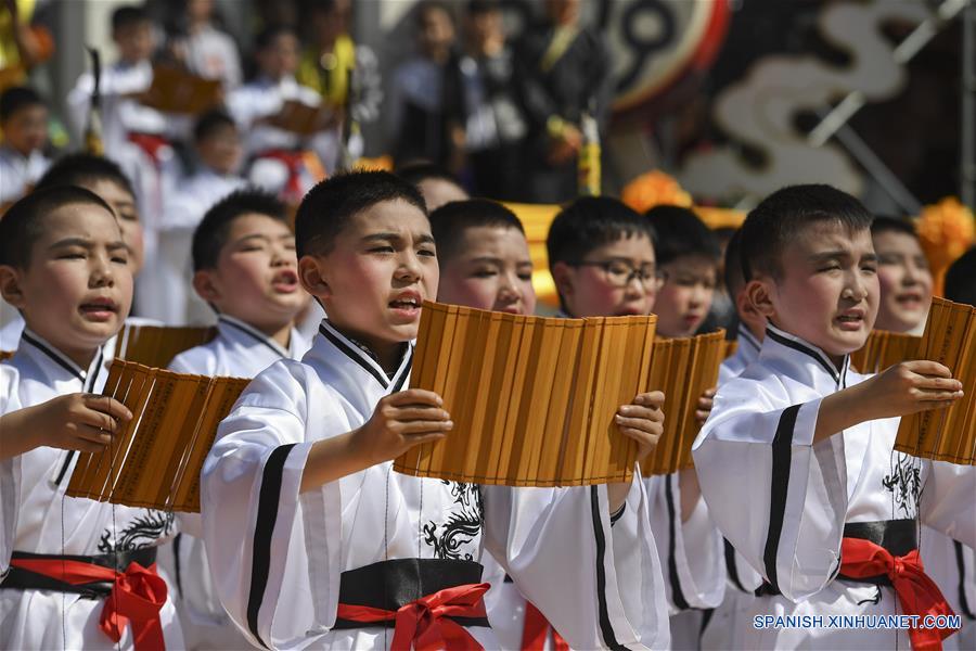 Ni?os leen en la ceremonia en memoria de Zhang Qian, en el condado de Chenggu, en la provincia de Shaanxi, en el noroeste de China, el 3 de abril de 2018. Zhang Qian, un emisario real de la Dinastía Han (202 a.C.-220 d.C.) de China, viajó hacia el oeste en una misión de paz y abrió una ruta terrestre que unió al este del oeste, en una atrevida empresa que llegó a ser conocida como el viaje de Zhan Qian a regiones del oeste. (Xinhua/Tao Ming)