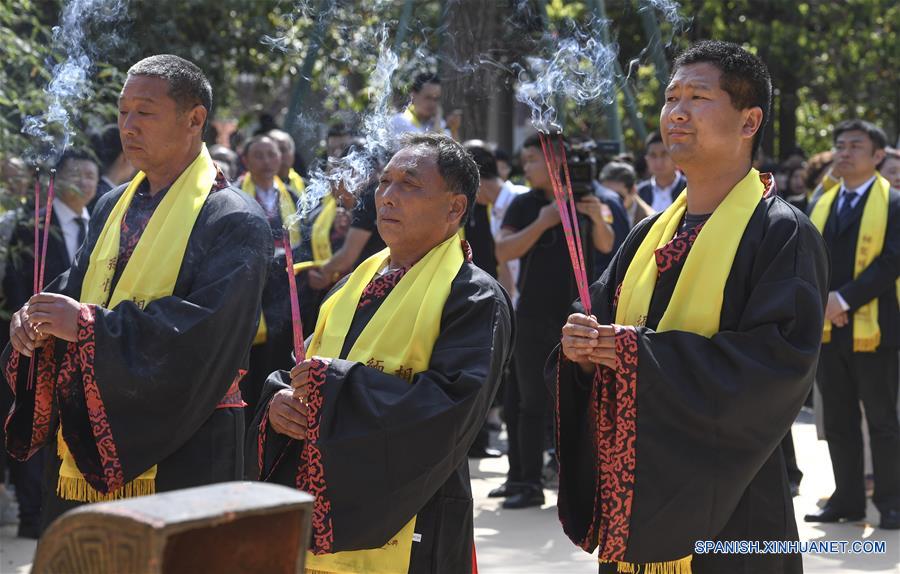 SHAANXI, abril 3, 2018 (Xinhua) -- Descendientes de Zhang Qian ofrecen incienso en la ceremonia en memoria de Zhang Qian, en el condado de Chenggu, en la provincia de Shaanxi, en el noroeste de China, el 3 de abril de 2018. Zhang Qian, un emisario real de la Dinastía Han (202 a.C.-220 d.C.) de China, viajó hacia el oeste en una misión de paz y abrió una ruta terrestre que unió al este del oeste, en una atrevida empresa que llegó a ser conocida como el viaje de Zhan Qian a regiones del oeste. (Xinhua/Tao Ming)
