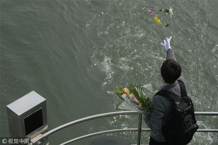Un hombre esparce flores en el mar durante un entierro en el mar celebrado en el barco Guobin 9, el 2 de abril de 2018. [Foto / Xinhua]