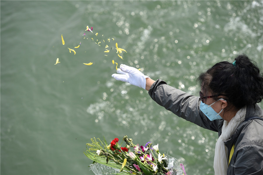 Una mujer esparce flores en el mar durante un entierro en el mar celebrado en el barco Guobin 9, el 2 de abril de 2018. [Foto / Xinhua]