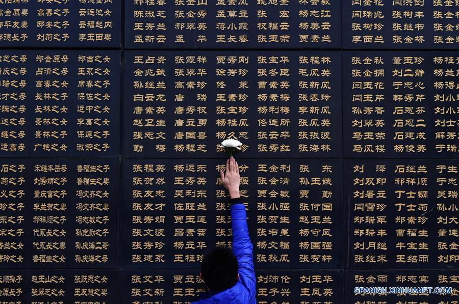 HEBEI, abril 4, 2018 (Xinhua) -- Una persona coloca un crisantemo en el muro memorial para recordar a las víctimas del terremoto de Tangshan de 1976, previo al Festival Qingming, en Tangshan, en la provincia de Hebei, en el norte de China, el 4 de abril de 2018. (Xinhua/Dong Jun)