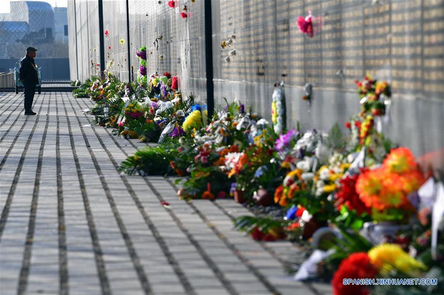 HEBEI, abril 4, 2018 (Xinhua) -- Flores son colocadas frente al muro memorial para recordar a las víctimas del terremoto de Tangshan de 1976, previo al Festival Qingming, en Tangshan, en la provincia de Hebei, en el norte de China, el 4 de abril de 2018. (Xinhua/Dong Jun)