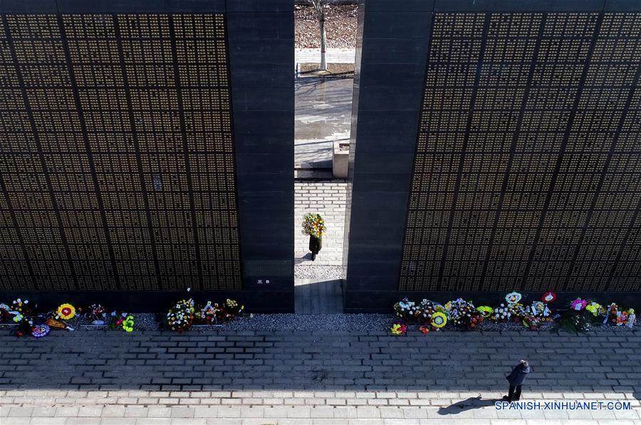 HEBEI, abril 4, 2018 (Xinhua) -- Una persona visita el muro memorial para recordar a las víctimas del terremoto de Tangshan de 1976, previo al Festival Qingming, en Tangshan, en la provincia de Hebei, en el norte de China, el 4 de abril de 2018. (Xinhua/Dong Jun)