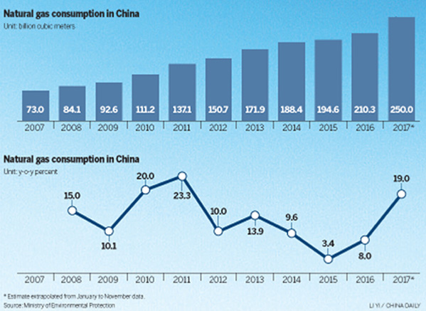 Por otra parte, la producción nacional de gas natural aumentó en 10,5 por ciento, mientras que las importaciones hicieron la diferencia, con un crecimiento del 28,9 por ciento. Desde el 2016, un 60 por ciento del gas utilizado en China procedía de la producción nacional y un 40 por ciento de las importaciones, aunque el gobierno central espera que las importaciones lleguen a un 50 por ciento para el 2020.