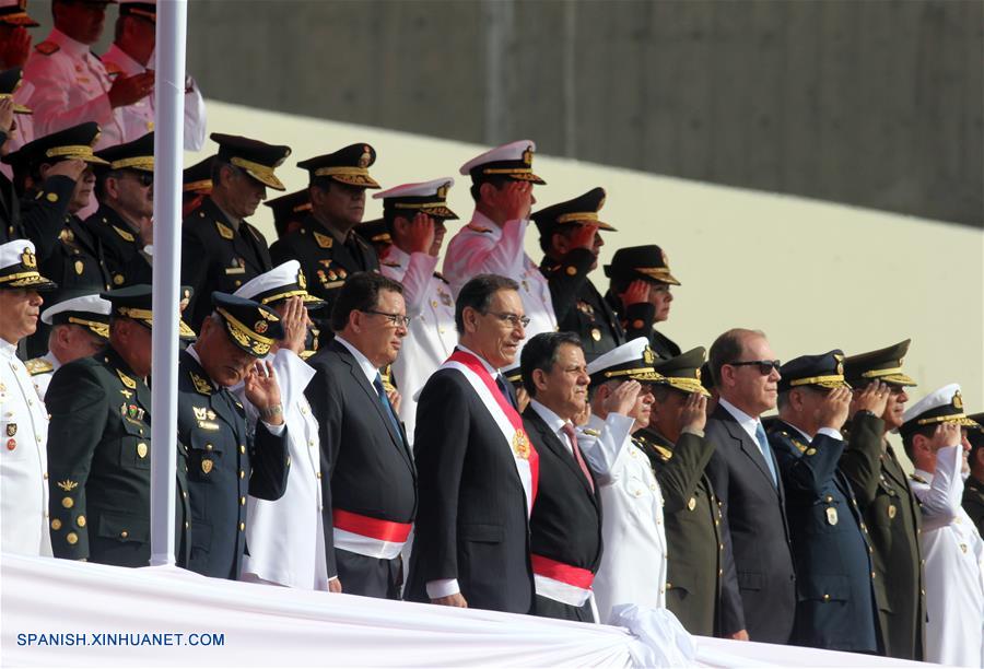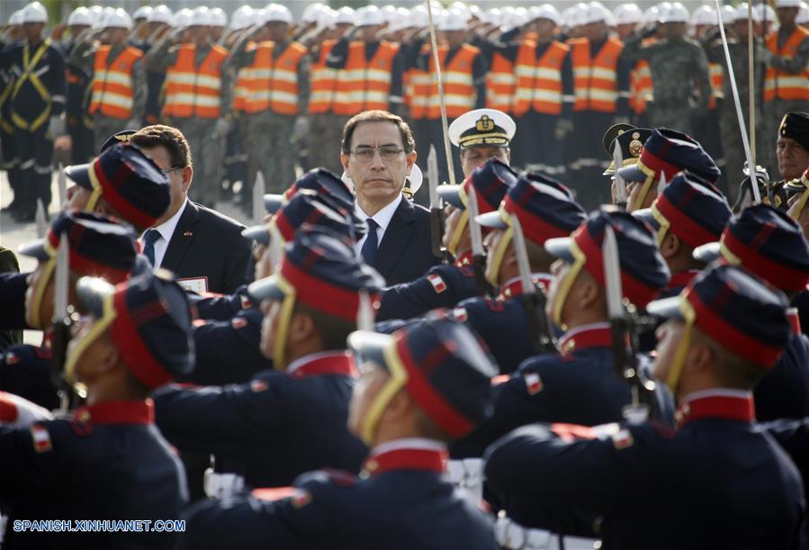 LIMA, abril 6, 2018 (Xinhua) -- El presidente peruano, Martín Alberto Vizcarra Cornejo (c), pronuncia un discurso durante la ceremonia de reconocimiento como jefe supremo de las Fuerzas Armadas y la Policía Nacional de Perú, en la Plaza Cáceres del Cuartel General del Ejército, en el distrito de San Borja, Lima, Perú, el 6 de abril de 2018. (Xinhua/Luis Camacho)