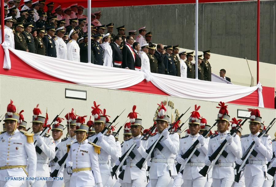 LIMA, abril 6, 2018 (Xinhua) -- El presidente peruano, Martín Alberto Vizcarra Cornejo (c-arriba), participa durante la ceremonia de reconocimiento como jefe supremo de las Fuerzas Armadas y la Policía Nacional de Perú, en la Plaza Cáceres del Cuartel General del Ejército, en el distrito de San Borja, Lima, Perú, el 6 de abril de 2018. (Xinhua/Luis Camacho)