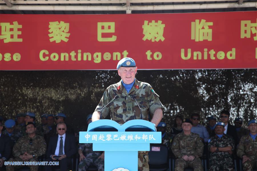 HANNIYAH, abril 6, 2018 (Xinhua) -- El general de división, Michael Beary, jefe de la misión y comandante de la Fuerza Interina de Naciones Unidas en Líbano (Finul), pronuncia un discurso en una ceremonia de entrega de medallas en el campamento del destacamento de ingeniería multifuncional de mantenimiento de paz de China en la localidad de Hanniyah en el sur de Líbano, el 6 de abril de 2018. Los 410 miembros del 16°contingente de elementos de mantenimiento de paz de China en Líbano recibieron el viernes la Medalla de Honor de Paz de la Organización de las Naciones Unidas (ONU), un mes antes de transferir la autoridad al contingente número 17. (Xinhua/Li Liangyong)