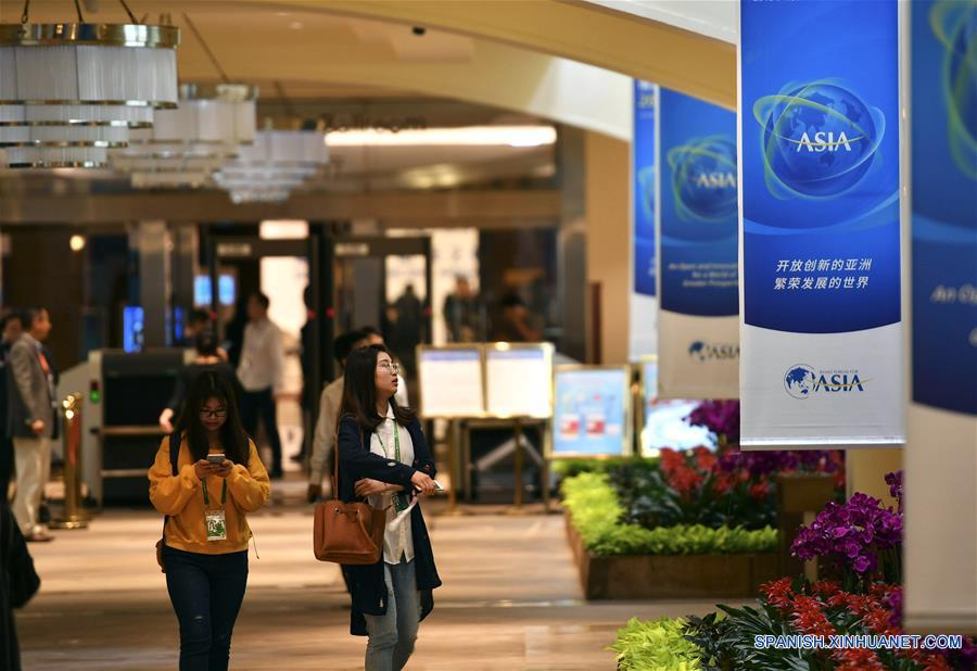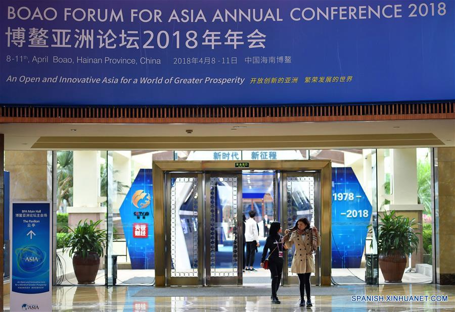 HAINAN, abril 7, 2018 (Xinhua) -- Personas caminan en un pasillo de la sede principal del Foro Boao de Asia (FBA), en la localidad de Boao, en la provincia de Hainan, en el sur de China, el 7 de abril de 2018. El foro, que se celebrará del 8 al 11 de abril en Boao, una localidad costera de Hainan, tendrá como tema "Una Asia abierta e innovadora para un mundo de mayor prosperidad". (Xinhua/Guo Cheng)