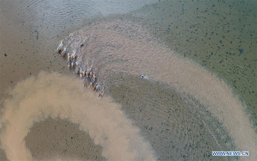 Ciervos milu galopan en los humedales alrededor del lago Poyang, provincia de Jiangxi, 3 de abril del 2018. [Foto: Xinhua]
