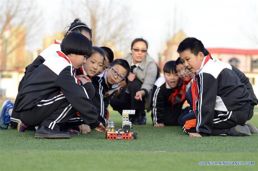 Estudiantes prueban un robot en una escuela primaria en el condado de Laoting, en la provincia de Hebei, en el norte de China, el 10 de abril de 2018. Robots han sido introducidos a los programas educacionales extracurriculares en la escuela. (Xinhua/Mu Yu)