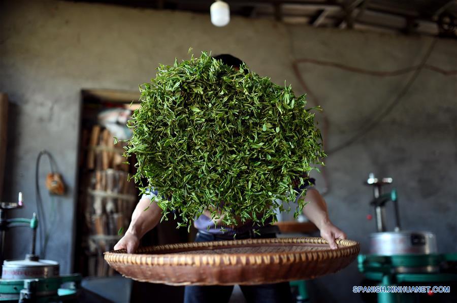 Un granjero cocina hojas de té en la villa Makou del distrito de Wanli, en la ciudad de Nanchang, en la provincia de Jiangxi, en el este de China, el 10 de abril de 2018. El jardín de té en esta villa, cubriendo un área de 1,000 Mu (67 hectáreas), fue transformado de una monta?a árida. Gracias a la industria del té, el ingreso anual per capita de los residentes ha incrementado en 3,000 yuanes (477 dólares estadounidenses). (Xinhua/Zhou Mi)