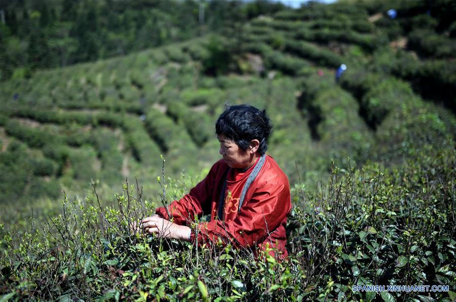 Una granjera recolecta hojas de té en la villa Makou del distrito de Wanli, en la ciudad de Nanchang, en la provincia de Jiangxi, en el este de China, el 10 de abril de 2018. El jardín de té en esta villa, cubriendo un área de 1,000 Mu (67 hectáreas), fue transformado de una monta?a árida. Gracias a la industria del té, el ingreso anual per capita de los residentes ha incrementado en 3,000 yuanes (477 dólares estadounidenses). (Xinhua/Zhou Mi)