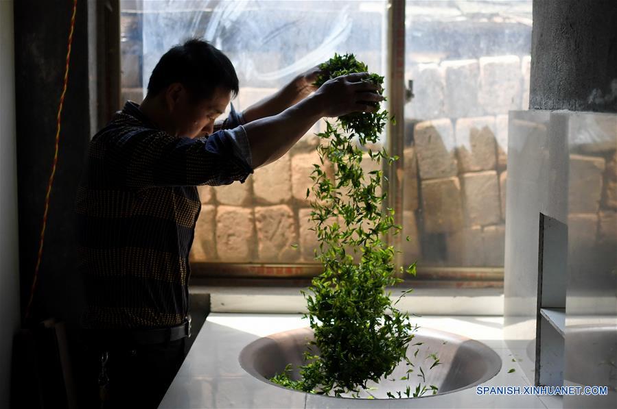 Un granjero cocina hojas de té en la villa Makou del distrito de Wanli, en la ciudad de Nanchang, en la provincia de Jiangxi, en el este de China, el 10 de abril de 2018. El jardín de té en esta villa, cubriendo un área de 1,000 Mu (67 hectáreas), fue transformado de una monta?a árida. Gracias a la industria del té, el ingreso anual per capita de los residentes ha incrementado en 3,000 yuanes (477 dólares estadounidenses). (Xinhua/Zhou Mi)