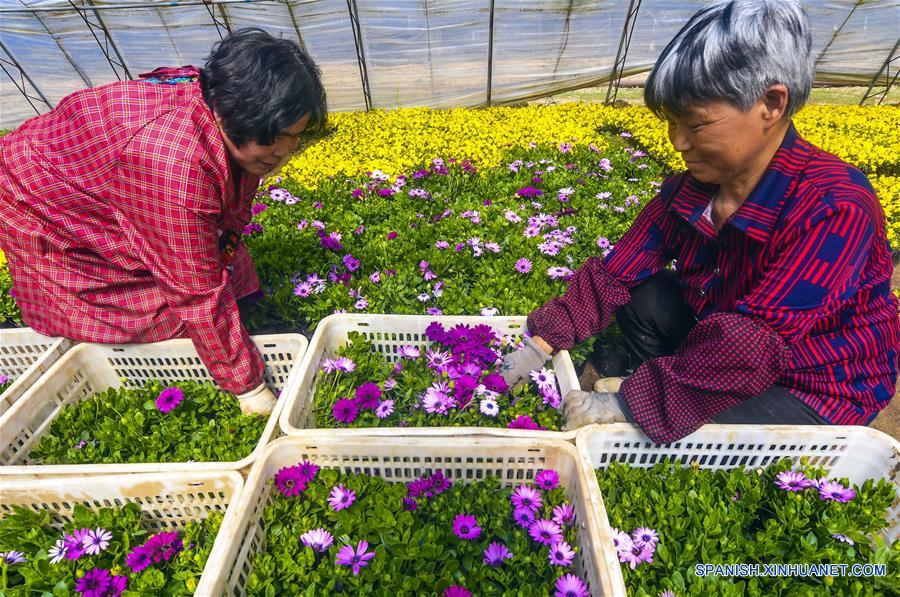 Dos floricultoras arreglan las caléndulas en una base de flores, en la ciudad de Langfang, provincia de Hebei, en el norte de China, el 12 de abril de 2018. Los floricultores del lugar se han beneficiado enormemente de la promoción del gobierno local del funcionamiento de los negocios de flores que integra a compa?ías, floricultores y bases de plantación. (Xinhua/Li Xiaoguo)
