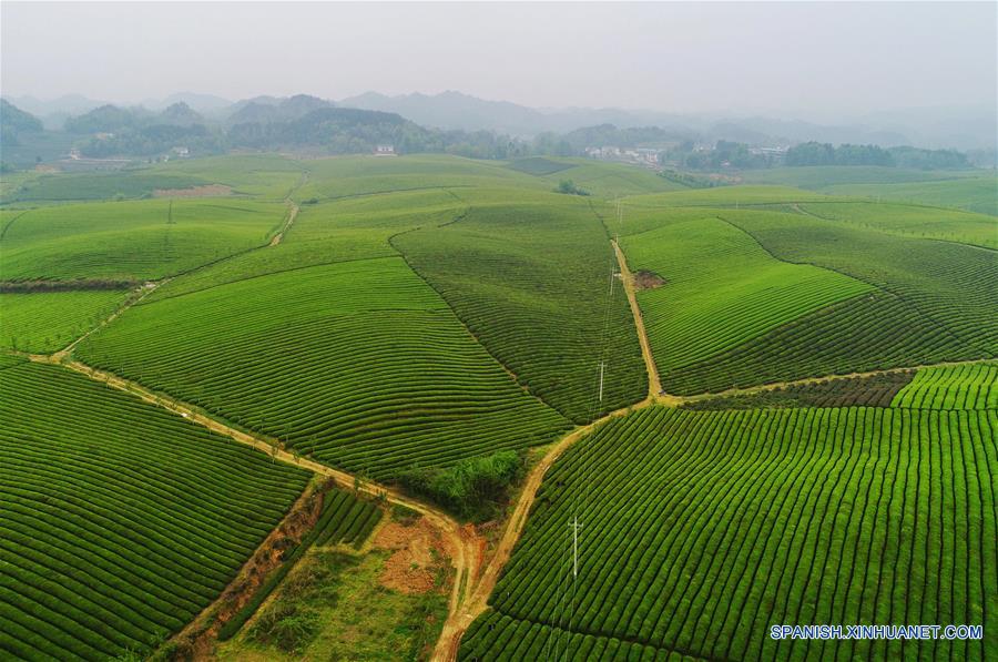 Vista aérea de un jardín de té en el municipio Yongxing de Meitan, en la provincia de Guizhou, en el suroeste de China, el 11 de abril de 2018. (Xinhua/Liu Xu)