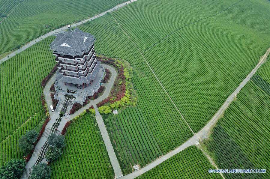 Vista aérea de un jardín de té en el municipio Yongxing de Meitan, en la provincia de Guizhou, en el suroeste de China, el 11 de abril de 2018. (Xinhua/Ou Dongqu)