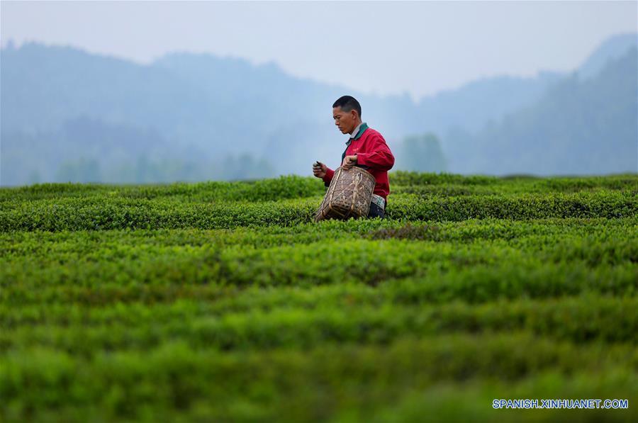 Un granjero recolecta hojas de té en un jardín de té en el municipio Yongxing de Meitan, en la provincia de Guizhou, en el suroeste de China, el 11 de abril de 2018. (Xinhua/Liu Xu)