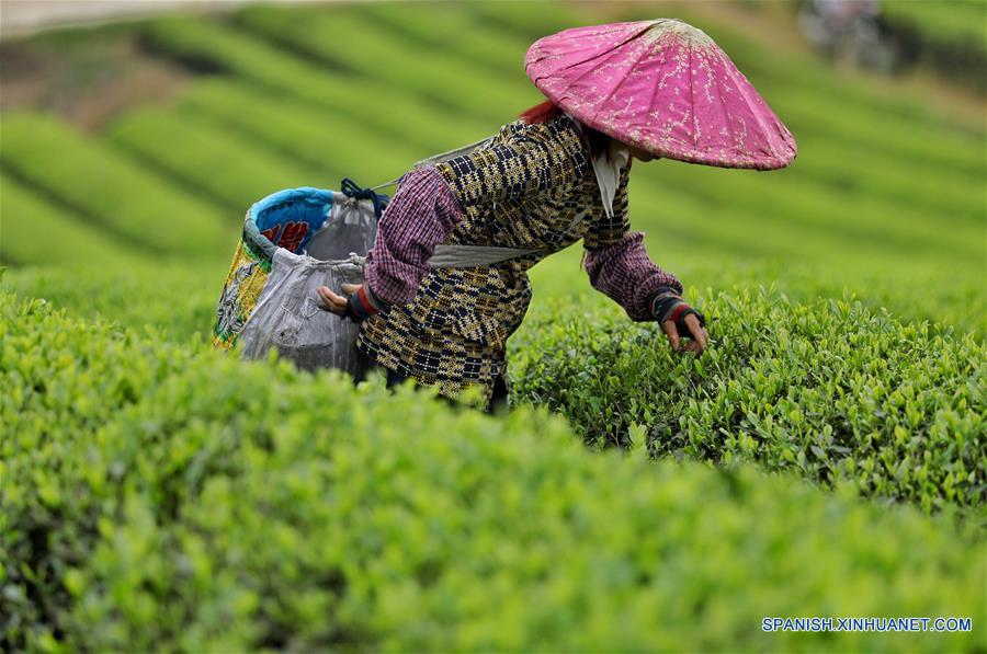 Una granjera recolecta hojas de té en un jardín de té en el municipio Yongxing de Meitan, en la provincia de Guizhou, en el suroeste de China, el 11 de abril de 2018. (Xinhua/Liu Xu)