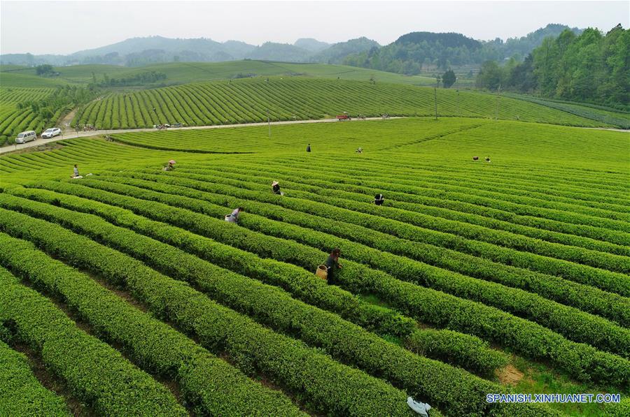 Granjeros recolectan hojas de té en un jardín de té en el municipio Yongxing de Meitan, en la provincia de Guizhou, en el suroeste de China, el 11 de abril de 2018. (Xinhua/Ou Dongqu)