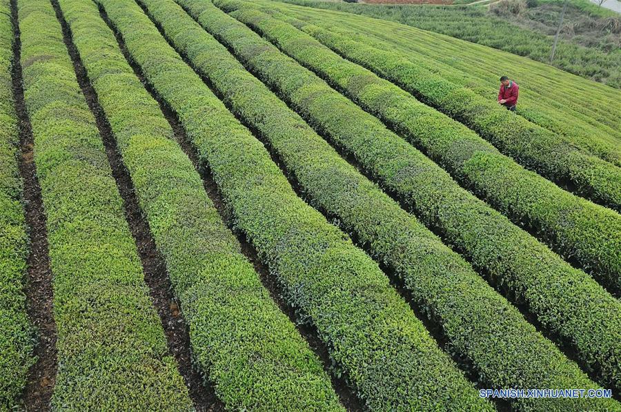 GUIZHOU, abril 11, 2018 (Xinhua) -- Un granjero recolecta hojas de té en un jardín de té en el municipio Yongxing de Meitan, en la provincia de Guizhou, en el suroeste de China, el 11 de abril de 2018. (Xinhua/Ou Dongqu)