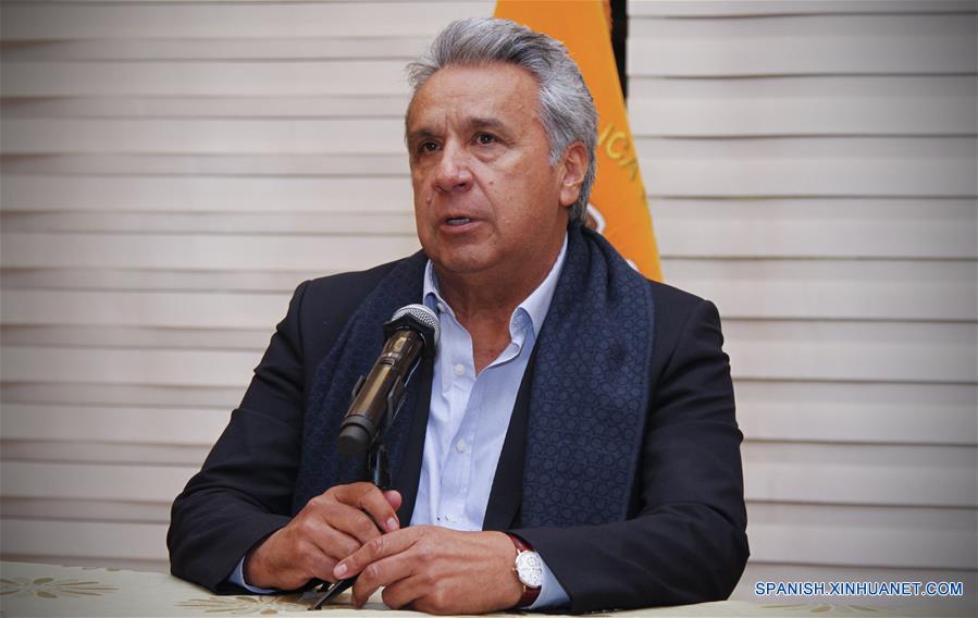 QUITO, abril 12, 2018 (Xinhua) -- El presidente de Ecuador, Lenín Moreno, participa en una conferencia de prensa a su regreso de Lima, en el aeropuerto Mariscal Sucre en Quito, capital de Ecuador, el 12 de abril de 2018. El presidente de Ecuador, Lenín Moreno, anunció el jueves su regreso inmediato al país desde Perú, a donde viajó para participar en la Cumbre de las Américas, para atender una "situación crítica" en torno al secuestro de un equipo periodístico del diario local El Comercio, ocurrido el pasado 26 de marzo en la frontera con Colombia. La privada organización Fundación Para la Libertad de Prensa (FLIP) entregó el jueves al vicepresidente colombiano, Oscar Naranjo, tres fotografías en las que presuntamente aparecen los cadáveres de tres periodistas ecuatorianos que fueron secuestrados por un grupo disidente de las FARC. (Xinhua/Santiago Armas)