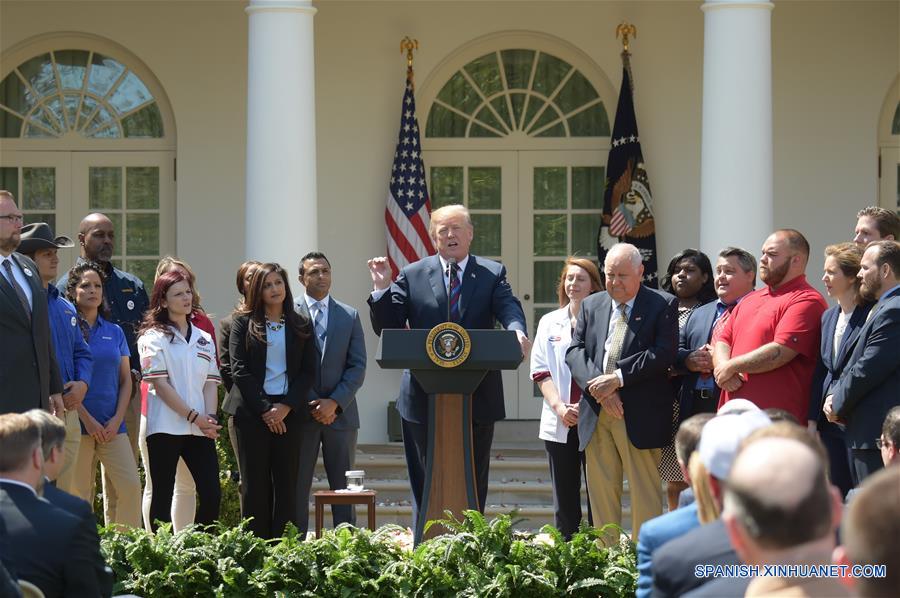 WASHINGTON D.C., abril 12, 2018 (Xinhua) -- El presidente estadounidense Donald Trump (c) pronuncia un discurso en la Casa Blanca, en Washington D.C., Estados Unidos, el 12 de abril de 2018. El presidente de Estados Unidos, Donald Trump, indicó el jueves que va a celebrar una reunión sobre Siria y que las decisiones sobre la respuesta estadounidense al presunto ataque con armas químicas serán tomadas "bastante pronto". (Xinhua/Yang Chenglin)