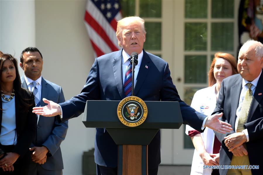 WASHINGTON D.C., abril 12, 2018 (Xinhua) -- El presidente estadounidense Donald Trump (c) pronuncia un discurso en la Casa Blanca, en Washington D.C., Estados Unidos, el 12 de abril de 2018. El presidente de Estados Unidos, Donald Trump, indicó el jueves que va a celebrar una reunión sobre Siria y que las decisiones sobre la respuesta estadounidense al presunto ataque con armas químicas serán tomadas "bastante pronto". (Xinhua/Yang Chenglin)
