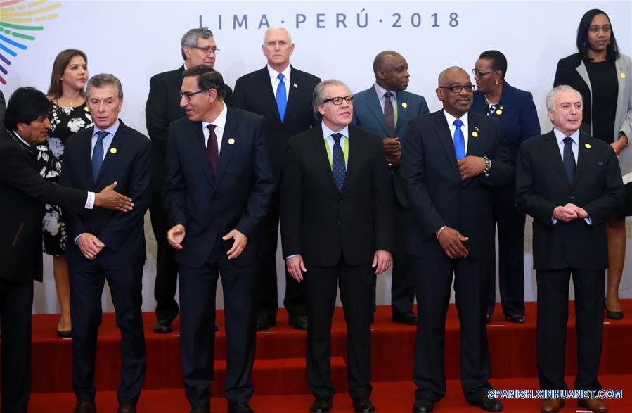El presidente de Bolivia, Evo Morales (i), extiende la mano al presidente de Perú, Martín Vizcarra (3-i), bajo la mirada del presidente de Argentina, Mauricio Macri (2-i), mientras asisten a la toma de la fotografía oficial de la VIII Cumbre de Las Américas, en Lima, Perú, el 14 de abril de 2018. Los jefes de Estado y de Gobierno, así como los representantes que participan en la VIII Cumbre de las Américas de Lima aprobaron el sábado por aclamación el "Compromiso de Lima" sobre la lucha contra la corrupción en la región. (Xinhua/Norman Córdova/ANDINA)