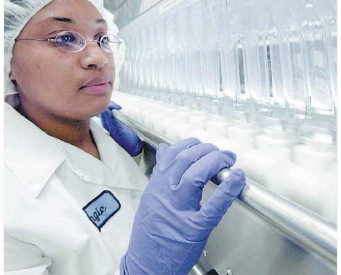 Una empleada de la planta de AstraZeneca en Estados Unidos inspecciona la línea de producción del medicamento contra el cáncer de pulmón Iressa. Proporcionado a China Daily