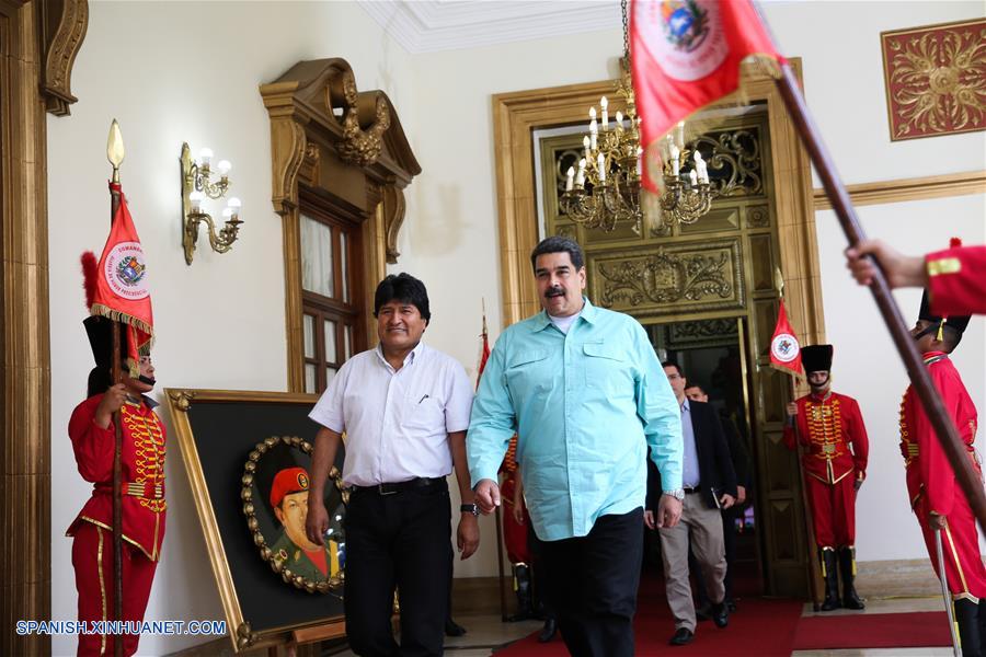 CARACAS, abril 15, 2018 (Xinhua) -- El presidente de Venezuela, Nicolás Maduro (d-frente), se reúne con su homólogo boliviano, Evo Morales (i-frente), en el Palacio de Miraflores, en Caracas, capital de Venezuela, el 15 de abril de 2018. De acuerdo con información de la prensa local, durante la reunión ambos mandatarios condenaron la guerra mediática que difunden algunos medios internacionales para justificar los ataques que realizó el viernes Estados Unidos en Siria, y destacaron la unidad entre Bolivia y Venezuela en la construcción del socialismo y un mundo equitativo. (Xinhua/Prensa Presidencial/AVN)