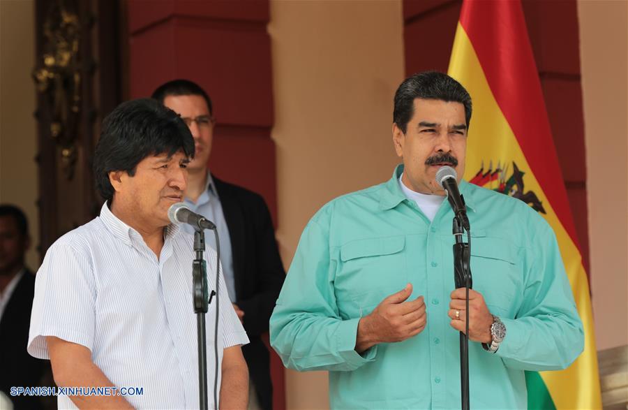 CARACAS, abril 15, 2018 (Xinhua) -- El presidente de Venezuela, Nicolás Maduro (d-frente) y su homólogo boliviano, Evo Morales (i-frente), participan en una conferencia de prensa en el Palacio de Miraflores, en Caracas, capital de Venezuela, el 15 de abril de 2018. De acuerdo con información de la prensa local, durante la reunión ambos mandatarios condenaron la guerra mediática que difunden algunos medios internacionales para justificar los ataques que realizó el viernes Estados Unidos en Siria, y destacaron la unidad entre Bolivia y Venezuela en la construcción del socialismo y un mundo equitativo. (Xinhua/Prensa Presidencial/AVN)