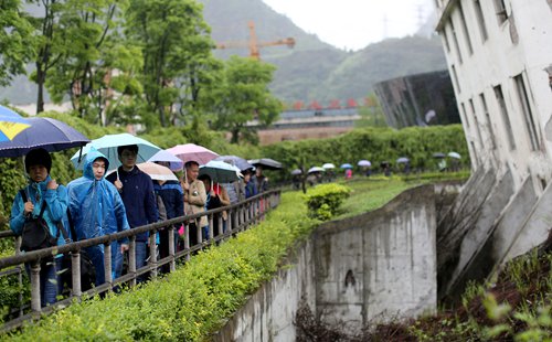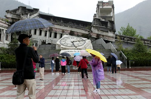 Turistas visitan las ruinas de la escuela secundaria Xuankou en Yingxiu, provincia de Sichuan, destruida por el terremoto de Wenchuan hace 10 a?os.(Foto: Hui Yang/ GT)