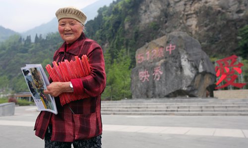 Una mujer vende souvenirs delante del Memorial a las Víctimas del Terremoto de Wenchuan, en Yingxiu. (Foto: Hui Yang/ GT)