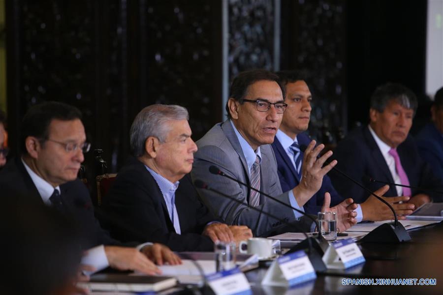 LIMA, abril 16, 2018 (Xinhua) -- El presidente de Perú, Martín Vizcarra (c), participa en la reunión Gore Ejecutivo 2018, en el Palacio de Gobierno, en Lima, Perú, el 16 de abril de 2018. El gobierno peruano se ha impuesto como reto reactivar las inversiones públicas para impulsar el crecimiento de la economía, afirmó el lunes el presidente Martín Vizcarra. El mandatario dijo que su administración trabajará en los sectores de transporte, reconstrucción, educación, salud y vivienda para superar el crecimiento económico del 2017, que fue de 2,5 por ciento. "Los retos que tenemos como gobierno es reactivar la economía y para hacerlo necesitamos reactivar la inversión pública", expresó Vizcarra en la reunión Gore Ejecutivo, que reúne a gobernadores y ministros para coordinar políticas públicas. (Xinhua/Prensa Presidencia/ANDINA)
