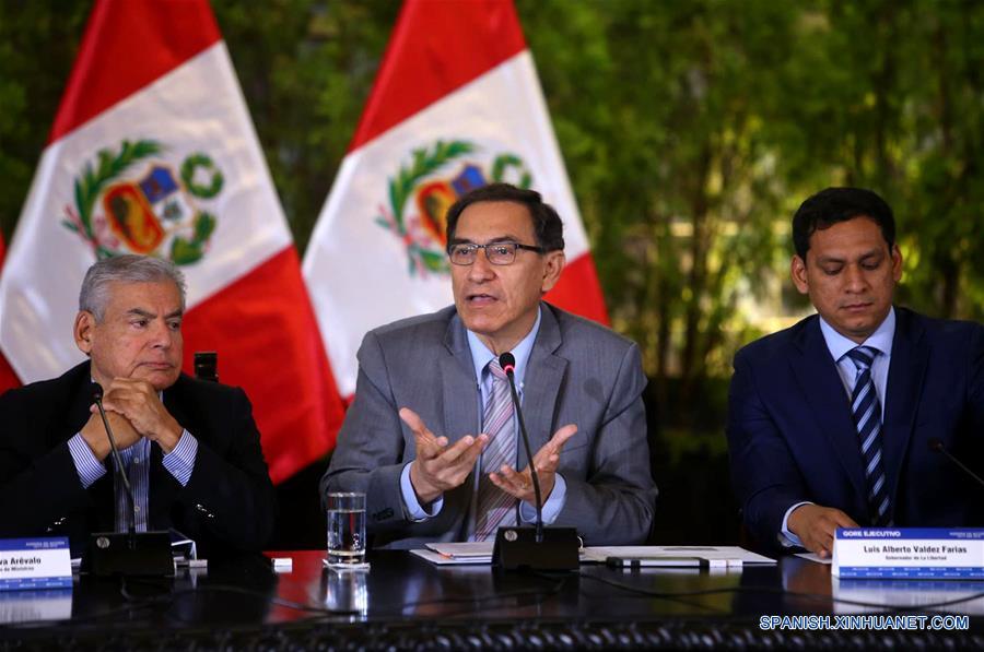 LIMA, abril 16, 2018 (Xinhua) -- El presidente de Perú, Martín Vizcarra (c), pronuncia un discurso en la reunión Gore Ejecutivo 2018, en el Palacio de Gobierno, en Lima, Perú, el 16 de abril de 2018. El gobierno peruano se ha impuesto como reto reactivar las inversiones públicas para impulsar el crecimiento de la economía, afirmó el lunes el presidente Martín Vizcarra. El mandatario dijo que su administración trabajará en los sectores de transporte, reconstrucción, educación, salud y vivienda para superar el crecimiento económico del 2017, que fue de 2,5 por ciento. "Los retos que tenemos como gobierno es reactivar la economía y para hacerlo necesitamos reactivar la inversión pública", expresó Vizcarra en la reunión Gore Ejecutivo, que reúne a gobernadores y ministros para coordinar políticas públicas. (Xinhua/Prensa Presidencia/ANDINA)
