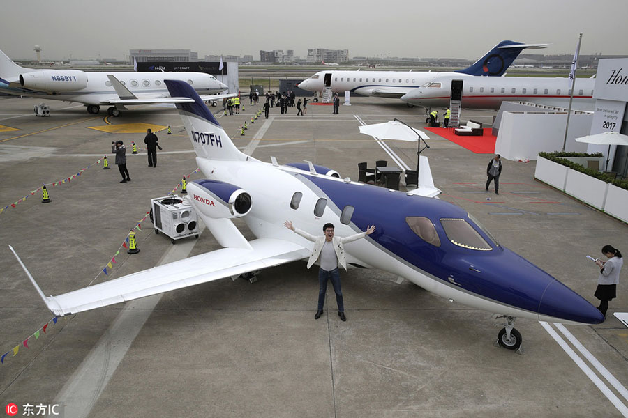 Avión Honda que se exhibe en la exposición que reúne unos 30 modelos de aviones de negocio con motivo de la Conferencia y Exposición Anual de Aviación de Negocios de Asia, que se celebrará en el aeropuerto internacional Hongqiao de Shanghai. [Foto: IC]