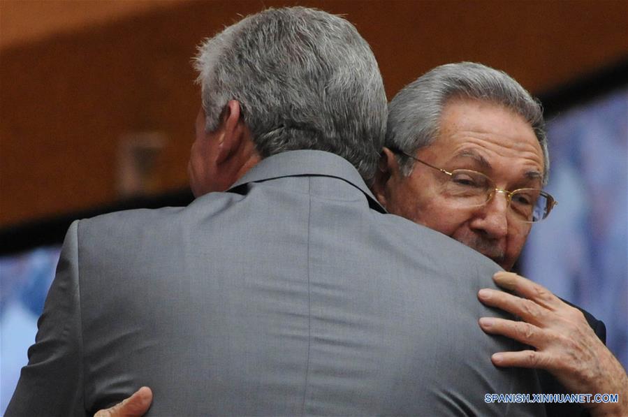 Imagen del 18 de abril de 2018 del presidente de Cuba, Raúl Castro (atrás), abrazando al primer vicepresidente de Cuba, Miguel Díaz-Canel (frente), durante la sesión constitutiva de la IX Legislatura de la Asamblea Nacional del Poder Popular llevada a cabo en el Palacio de las Convenciones en La Habana, Cuba. El nuevo presidente del Consejo de Estado de Cuba, Miguel Díaz-Canel, fue electo con el 99,83 por ciento de los votos emitidos por los 604 diputados presentes en la sesión constitutiva de la IX Legislatura de la Asamblea Nacional, informaron el jueves la Comisión Electoral Nacional. La presidenta de esta institución, Alina Balceiro, anunció que igualmente fue nombrado Salvador Valdés Mesa, primer vicepresidente, con el 100 por ciento de las boletas. (Xinhua/Vladimir Molina/Prensa Latina)