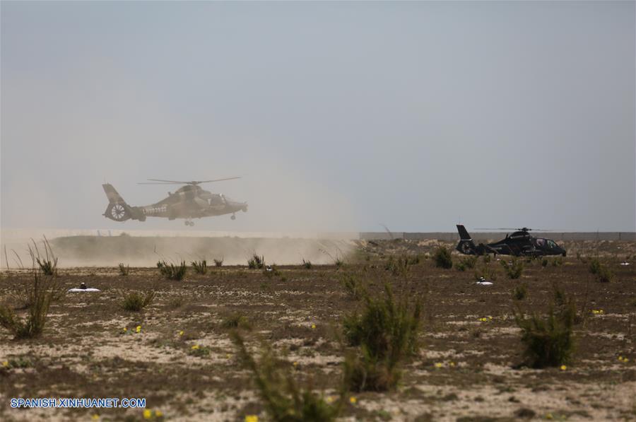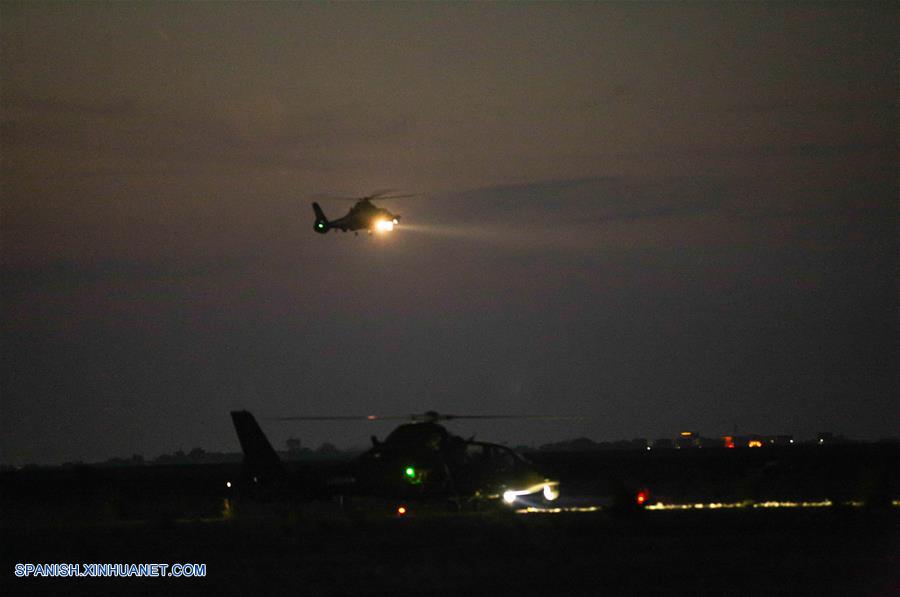 FUZHOU, abril 19, 2018 (Xinhua) -- Imagen del 18 de abril de 2018 de un helicóptero armado que transporta municiones despegando para participar en un ejercicio de fuego real frente a la costa sureste de China. La unidad aérea de la Fuerza Terrestre del Ejército Popular de Liberación (EPL) de China realizó el miércoles un ejercicio de fuego vivo en aguas frente a la costa suroriental del país, informaron el jueves las autoridades militares. El simulacro, con la participación de helicópteros armados de diferentes tipos, es una actividad anual de rutina, y prueba la capacidad de combate para todo tipo de situaciones de la fuerza, según la misma fuente. (Xinhua/Li Shilong)