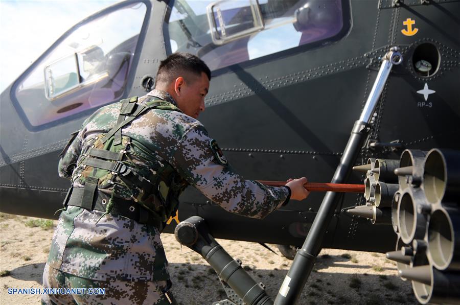 FUZHOU, abril 19, 2018 (Xinhua) -- Imagen del 18 de abril de 2018 de un helicóptero armado siendo cargado con municiones para un ejercicio de fuego real frente a la costa sureste de China. La unidad aérea de la Fuerza Terrestre del Ejército Popular de Liberación (EPL) de China realizó el miércoles un ejercicio de fuego vivo en aguas frente a la costa suroriental del país, informaron el jueves las autoridades militares. El simulacro, con la participación de helicópteros armados de diferentes tipos, es una actividad anual de rutina, y prueba la capacidad de combate para todo tipo de situaciones de la fuerza, según la misma fuente. (Xinhua/Li Shilong)
