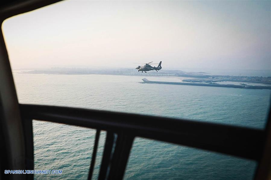 FUZHOU, abril 19, 2018 (Xinhua) -- Imagen del 18 de abril de 2018 de una captura de video mostrando a un helicóptero armado volando hacia aguas designadas durante un ejercicio de fuego real frente a la costa sureste de China. La unidad aérea de la Fuerza Terrestre del Ejército Popular de Liberación (EPL) de China realizó el miércoles un ejercicio de fuego vivo en aguas frente a la costa suroriental del país, informaron el jueves las autoridades militares. El simulacro, con la participación de helicópteros armados de diferentes tipos, es una actividad anual de rutina, y prueba la capacidad de combate para todo tipo de situaciones de la fuerza, según la misma fuente. (Xinhua/Str)