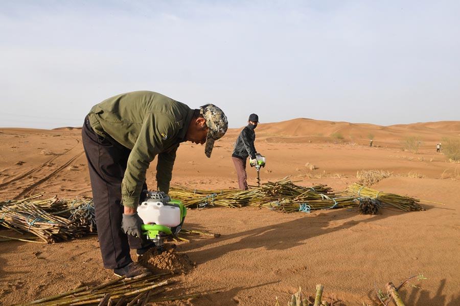 Los trabajadores plantan árboles en el desierto Kubuqi en la región autónoma de Mongolia Interior, al norte de China, el 21 de abril de 2018. [Foto / Xinhua]