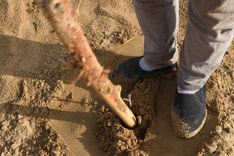 Un trabajador planta árboles en el desierto Kubuqi en la región autónoma de Mongolia Interior, al norte de China, el 21 de abril de 2018. [Foto / Xinhua]