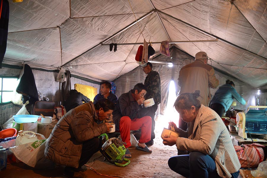 Los trabajadores almuerzan dentro de una tienda de campa?a en el desierto Kubuqi en la región autónoma de Mongolia Interior, al norte de China, el 21 de abril de 2018. [Foto / Xinhua]