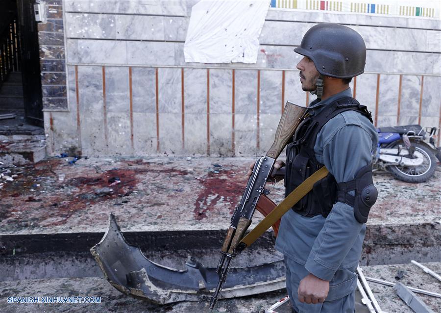 KABUL, abril 22, 2018 (Xinhua) -- Un oficial de seguridad vigila cerca del sitio donde se registró una explosión, en Kabul, Afganistán, el 22 de abril de 2018. (Xinhua/Str)